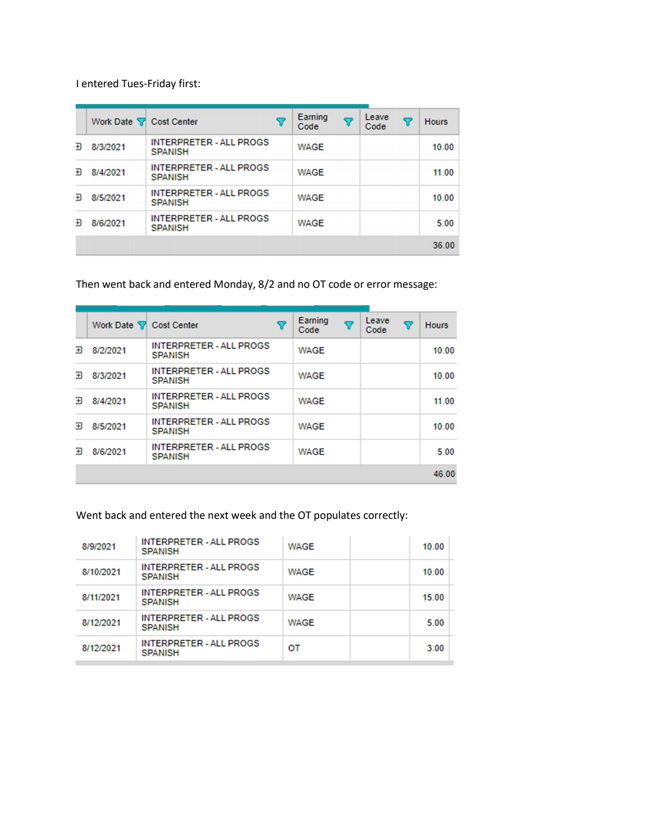 If the work date starts on Saturday and someone forgets to enter Monday but enters Tuesday-Friday but then goes back to enter Monday and those hours put them into OT, there is no OT calculated.