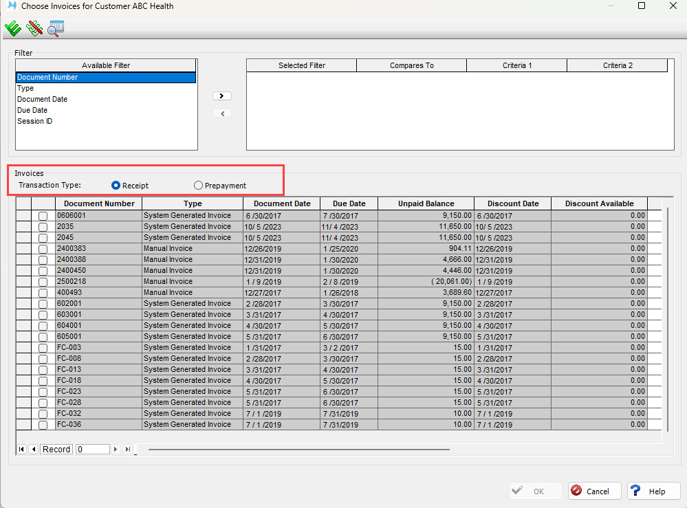 When selecting the customer ID on an AR receipt, there is no option to select the Transaction Type Receipt or Prepayment.